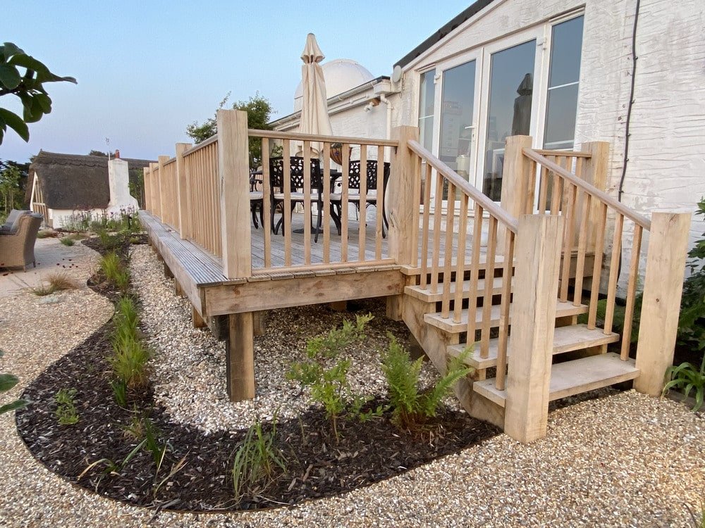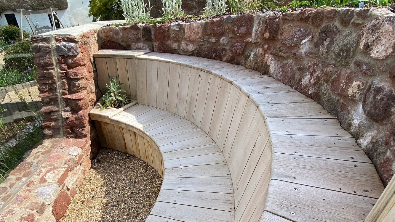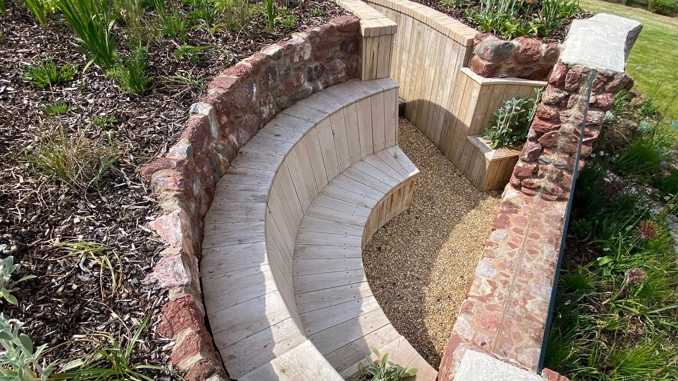 The finished garden looks superb and the reclaimed railway sleepers that were used for steps and a bench that have been stripped back and oiled look fantastic.