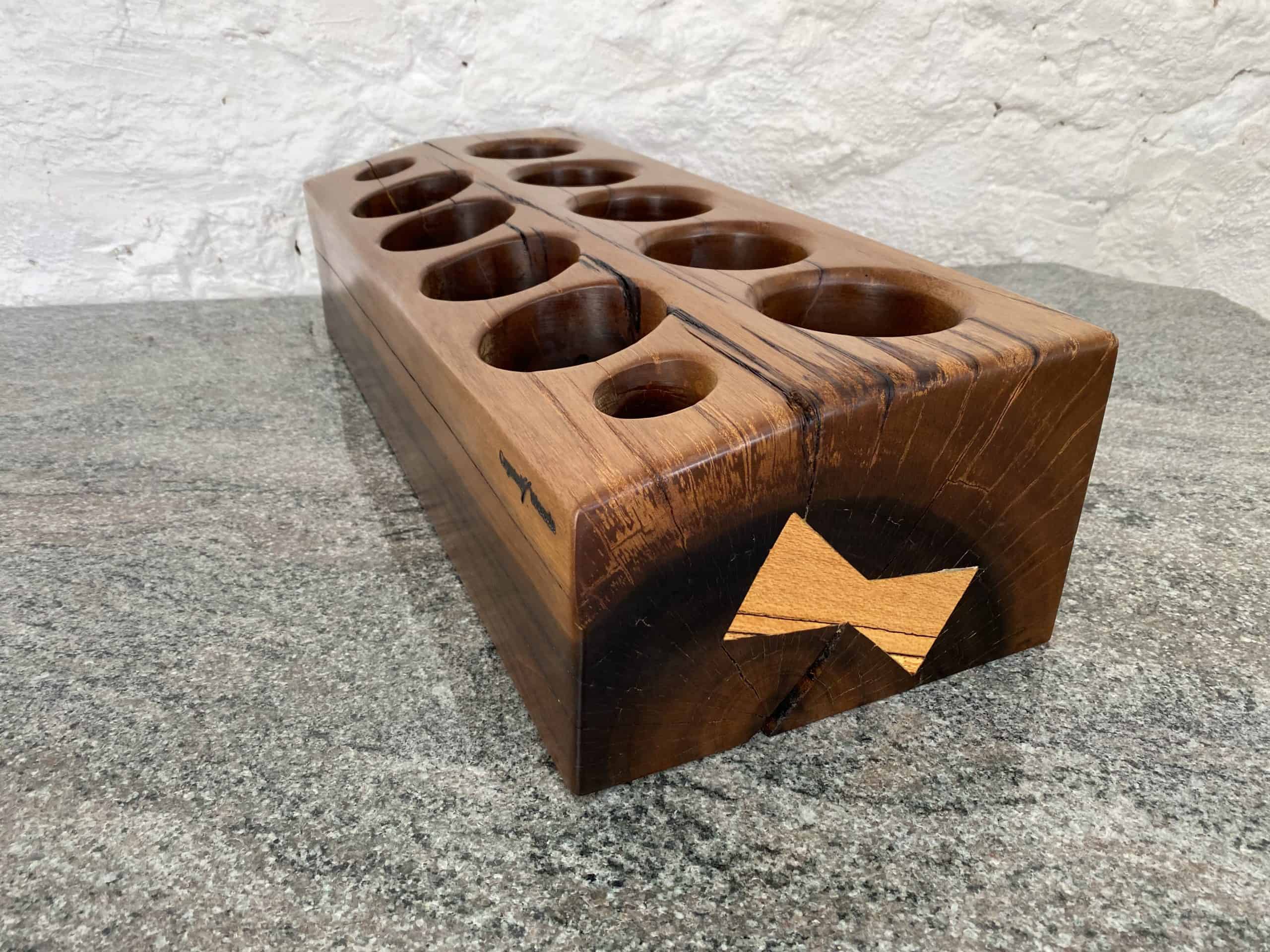 Whether displayed in a home bar, positioned on a dining room sideboard, or used outdoors for summer gatherings, this Bespoke Cocktail Bar instantly enhances its surroundings. Its compact form makes it versatile, while the richness of Greenheart and the contrasting butterfly details ensure it stands out as an elegant and sustainable statement piece.