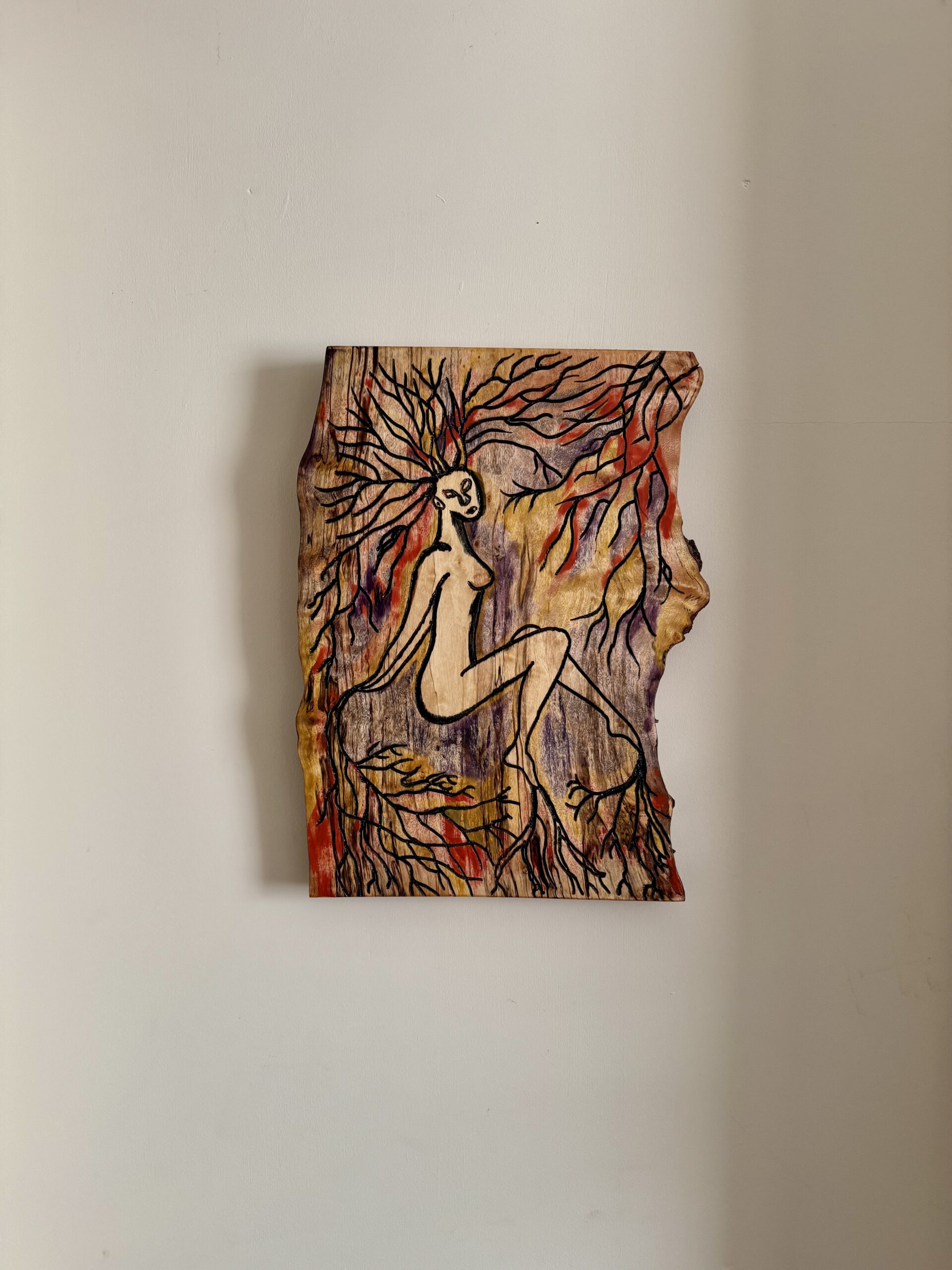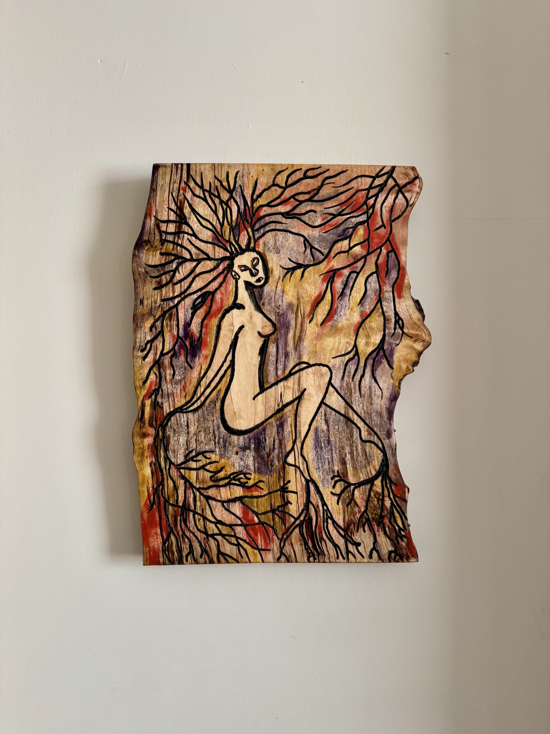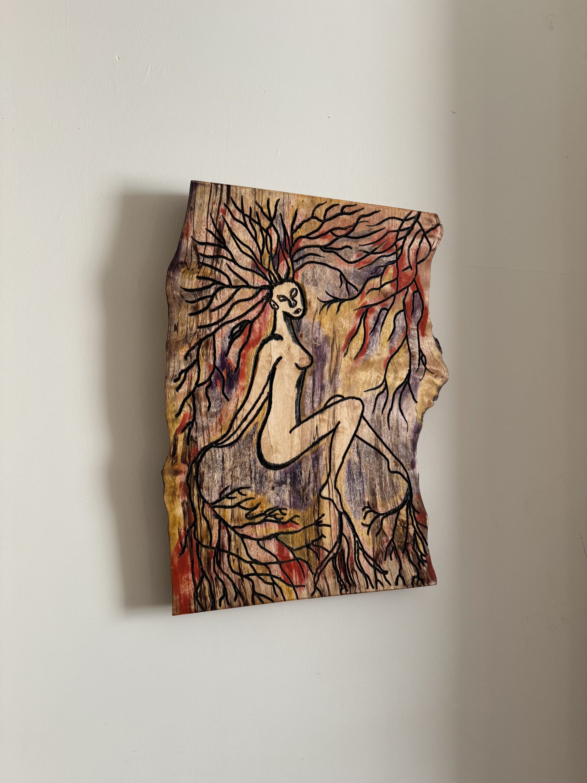“Rooted” is an original wooden wall art hanging that embodies the profound connection between humanity and the natural world. Created in collaboration with artist Dorota Chioma, this striking piece reimagines her original painting on a canvas of live-edge Spalted Birch, uniting the organic patterns of timber with figurative expression.