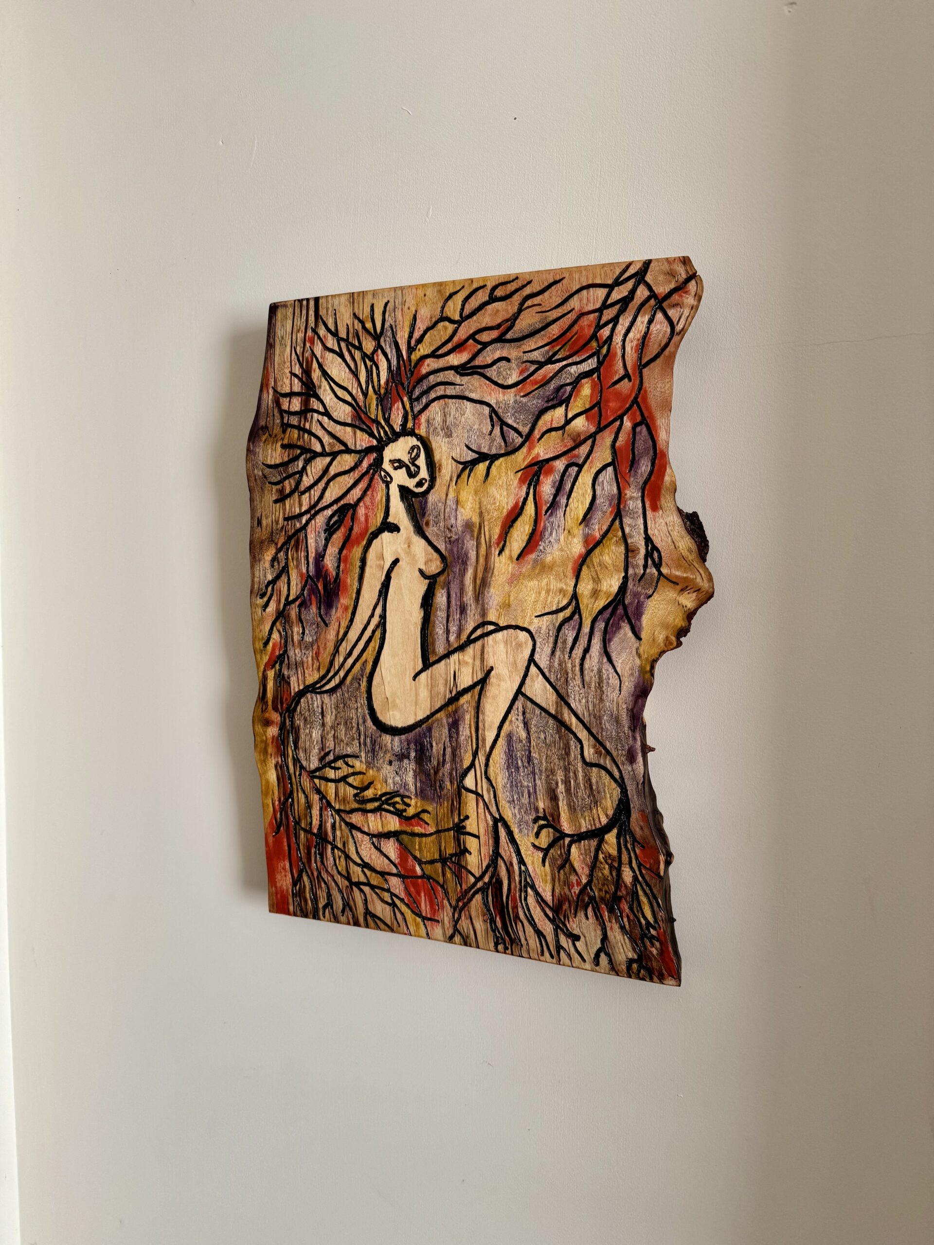The live-edge form of the Spalted Birch enhances this connection, its natural contours and spalting lines echoing the flow of branches and roots in the composition. Shades of burnt umber, earthy browns, and fiery reds bring movement and vibrancy, while delicate carved lines define the figure’s contours with precision.