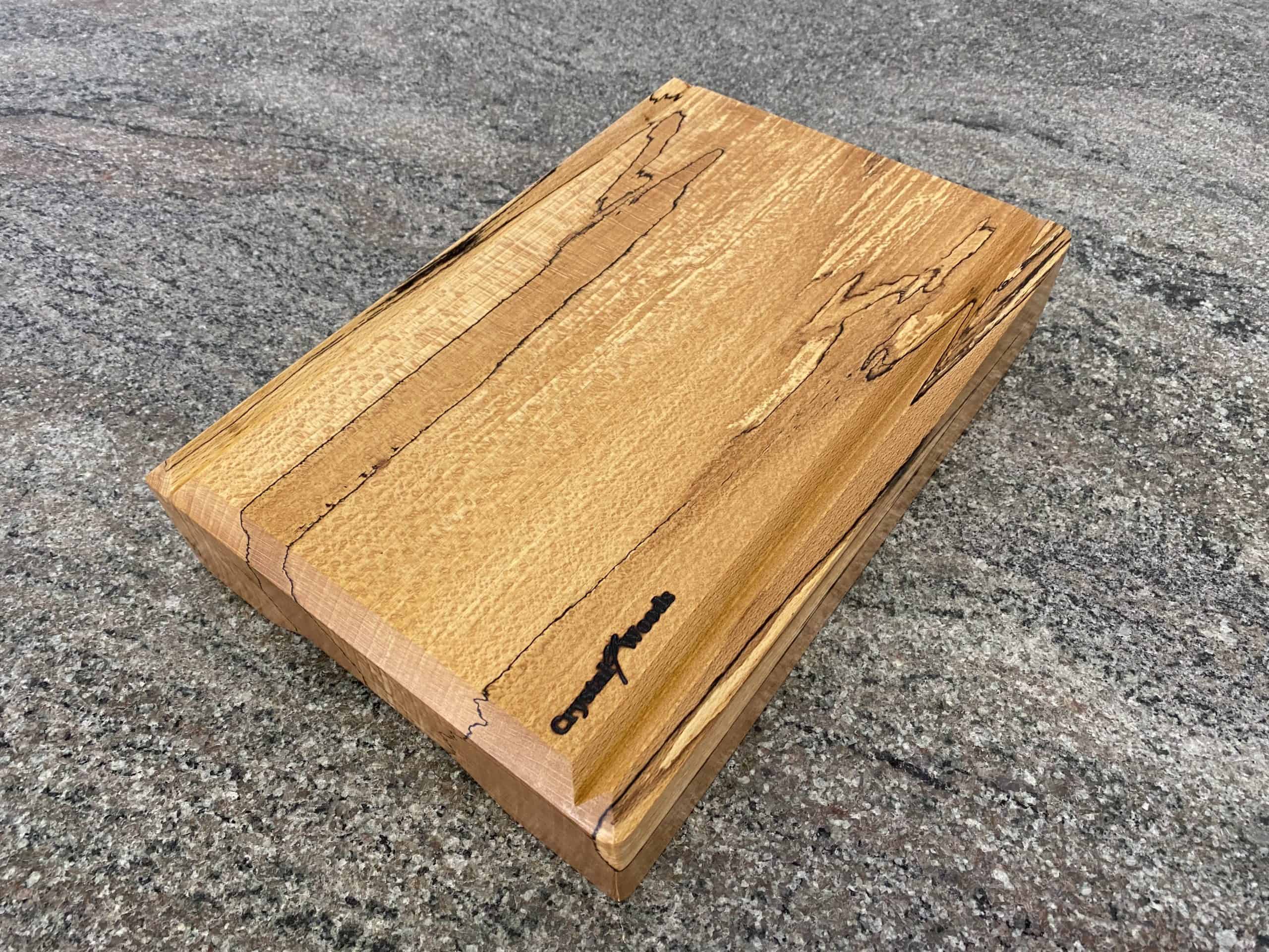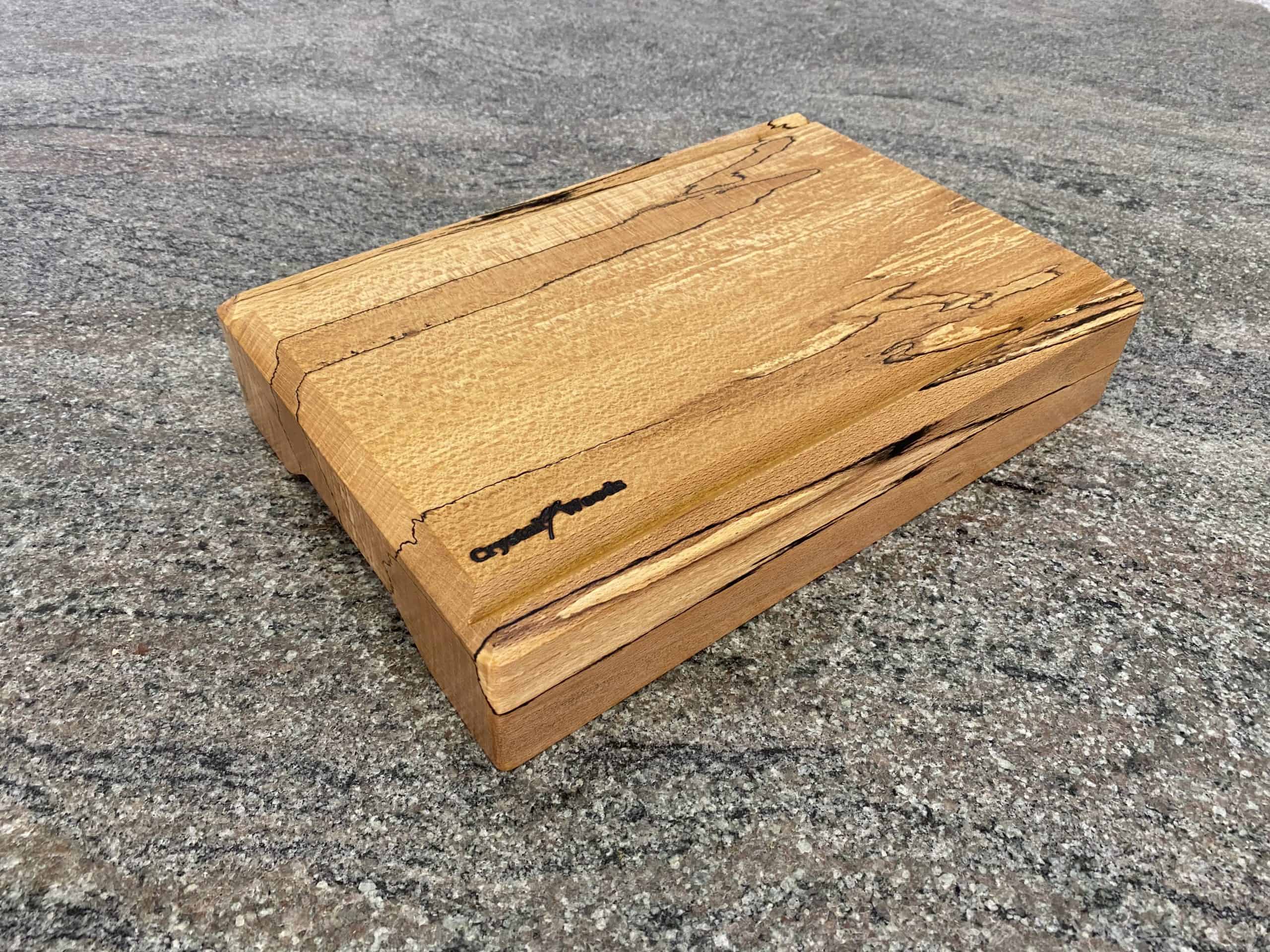 This spalted beech chopping board is sanded to a silky-smooth surface, then carefully oiled in multiple coats of food-safe oil before being sealed with a final layer of food-safe wax. This finishing process highlights the natural patterns of Spalted Beech, provides long-lasting protection against moisture, and leaves a subtle satin sheen.