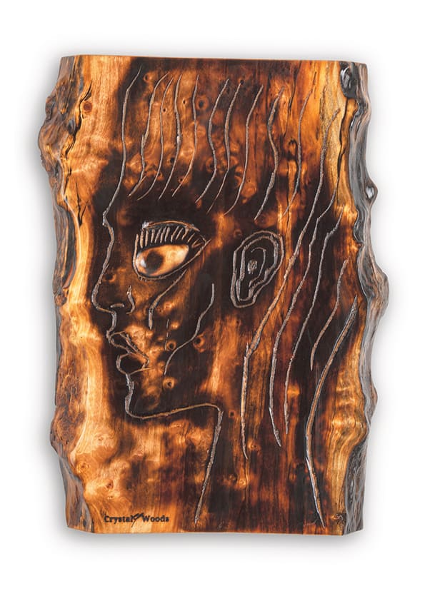 The rich tonal variations of Spalted Birch enhance the portrayal, with dark charred areas symbolising intensity and resilience, while lighter grain patterns evoke clarity and illumination. This duality mirrors the human condition and the balance of strength and vulnerability, of fire and stillness.