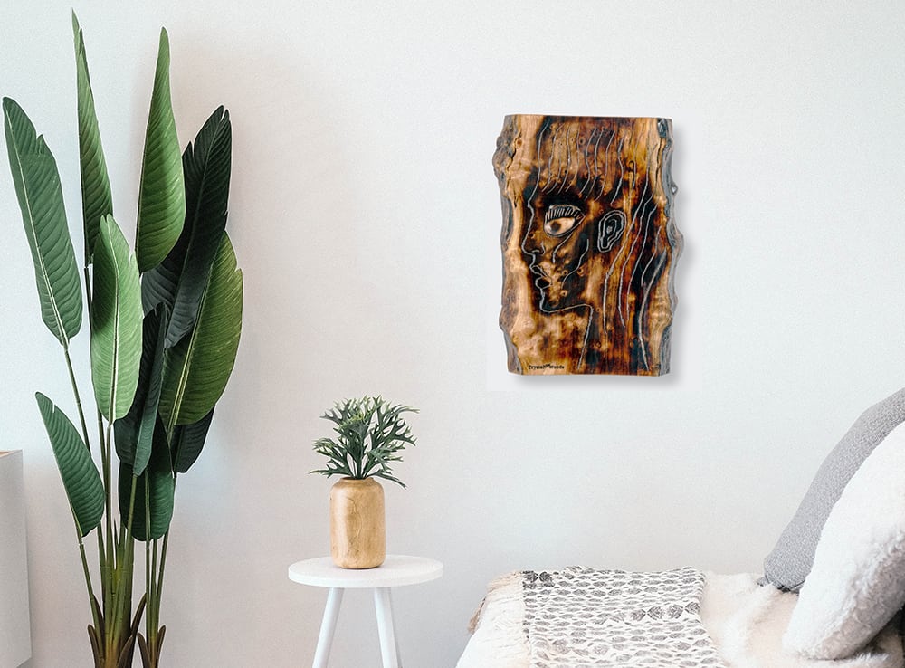 “The Energy Inside Me” was created through a meticulous process of carving and pyrography, with each line etched into the wood’s fibres by hand. The natural spalting of the birch forms part of the composition, its intricate patterns aligning with the wood wall art work’s theme of energy flowing through body and spirit.