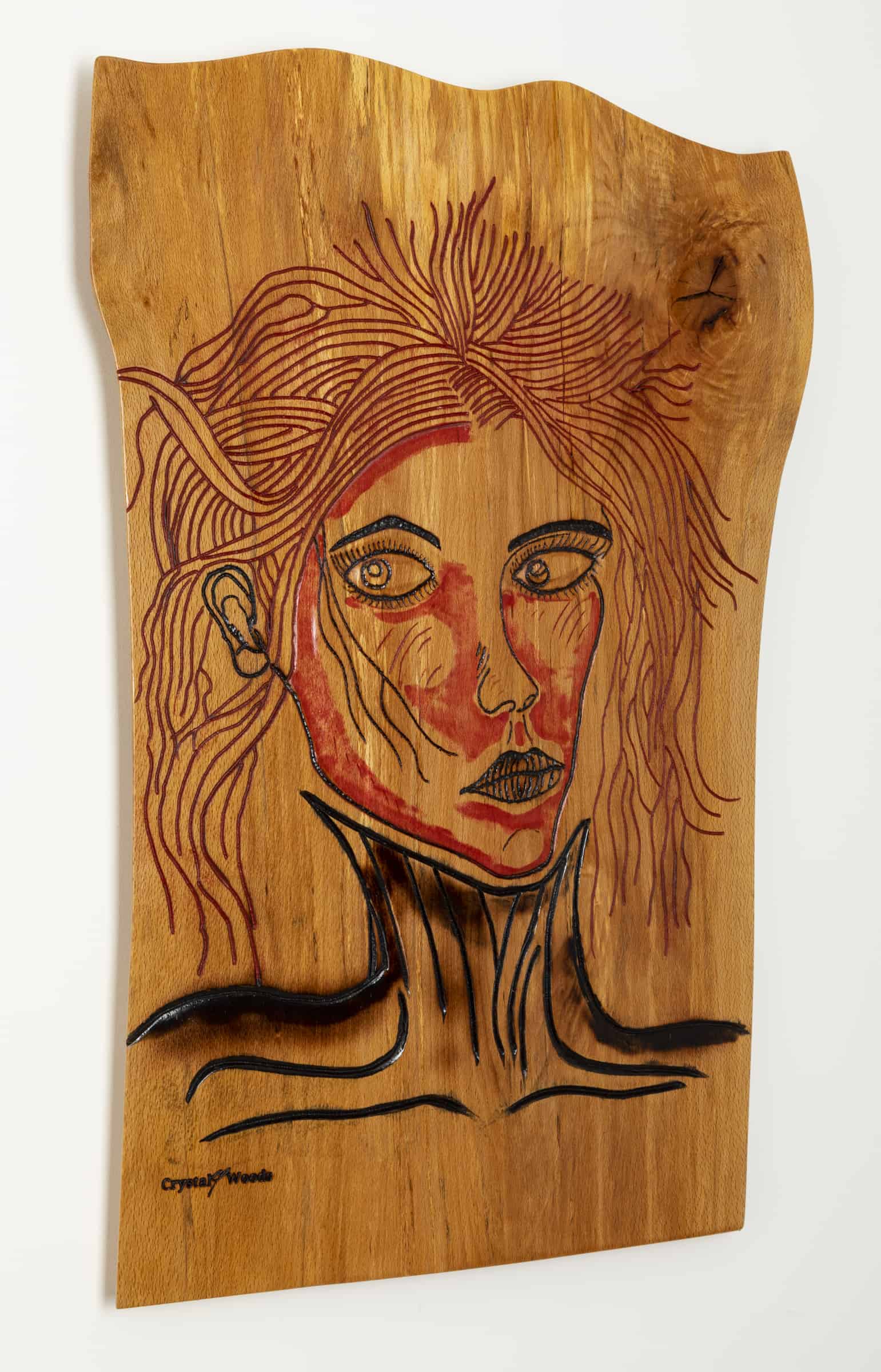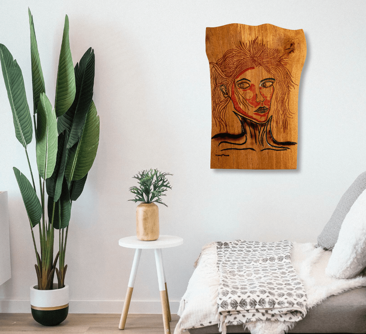 The subject’s face, etched with bold lines and vivid detail, draws the viewer into a world where rebellion and surrender coexist. The interplay of carving, burning, sculpting, and pyrography produces a subtle three-dimensional effect, giving the portrait striking depth and presence as a piece of wood wall art.