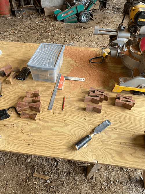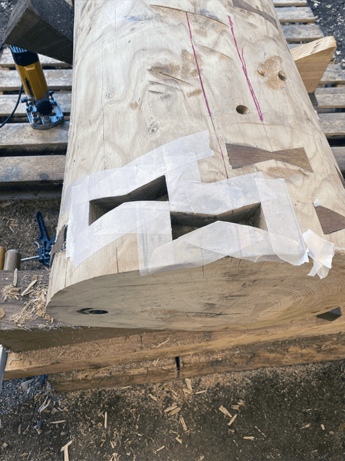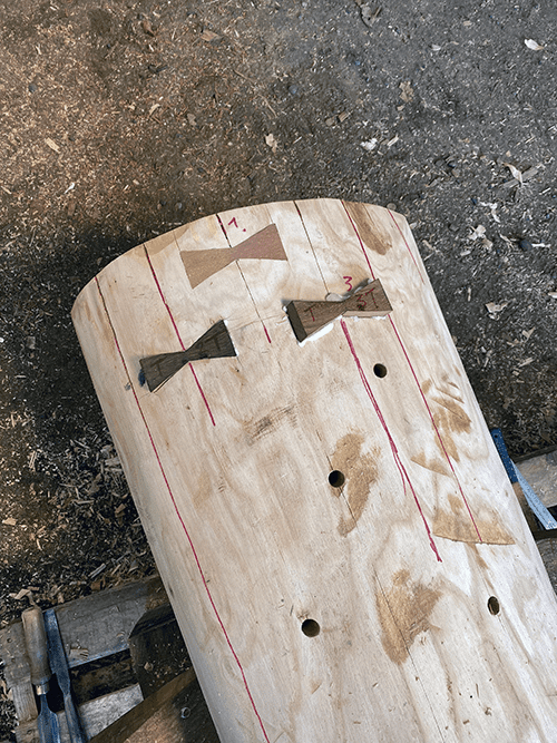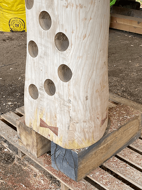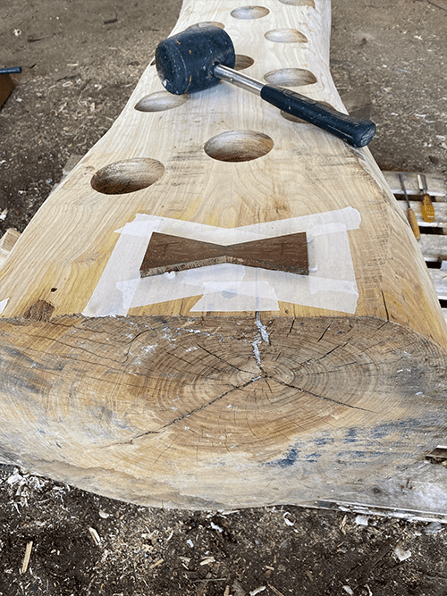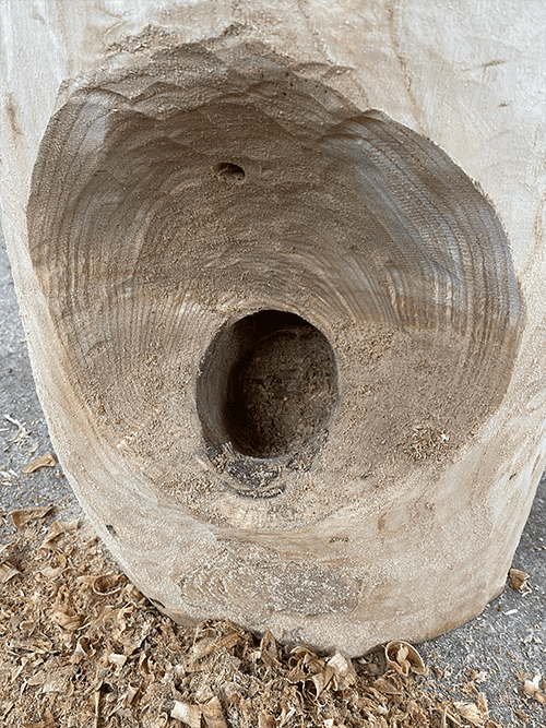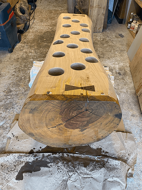 Once the trunk is cleaned and marked up, the difficult process of drilling out the holes for the wine bottles begins.