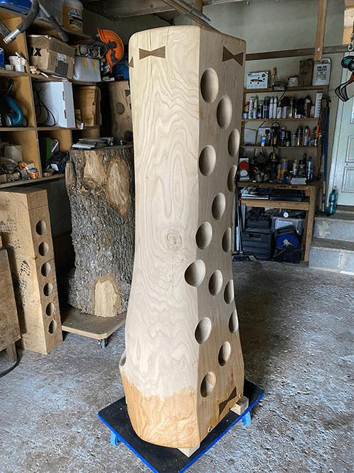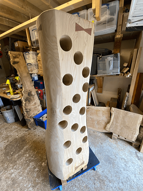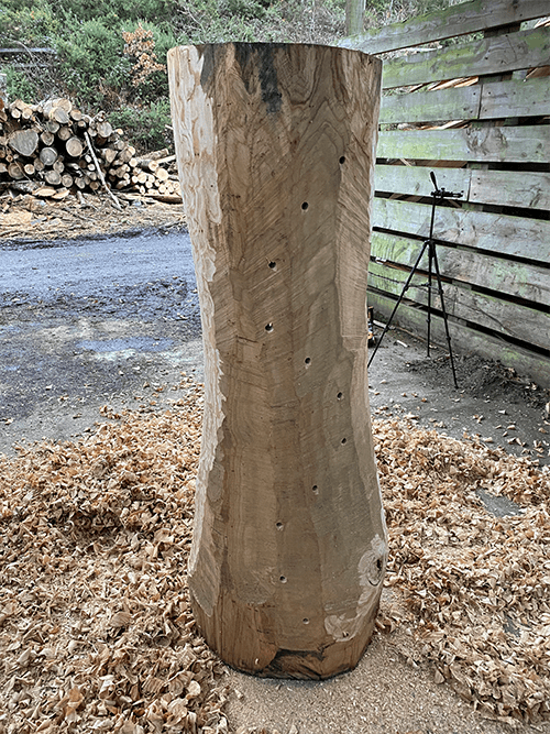 After the trunk is completely stabilised with ties, cleaned, planed and course sanded it is moved indoors to the workshop for the finishing process to begin. Here the finishing process begins. The holes are refined, bevelled and further sanded. Also, the trunk itself undergoes many hours of sanding with increasingly fine grits until it reaches a high degree of finish.